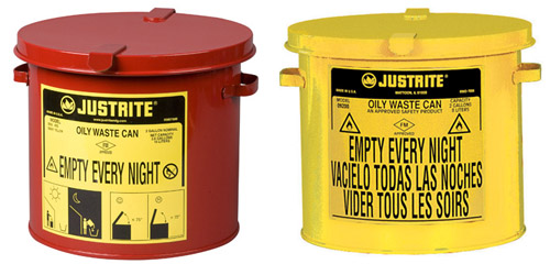 符合美國 OSHA 要求的油漬廢品罐是在使用浸有溶劑的布和抹布時的必備品。浸有溶劑、稀釋劑、亞麻籽油、可燃粘合劑和其他易燃液體的抹布和布如果隨意拋棄,將有極大的火災隱患。經過專門設計的蓋子打開的角度不超過 60 度,不使用時將保持關閉,將內容物與火源隔離,限制氧氣量,因此可有效地消除自燃隱患。圓形的構造和加高的罐底可促進罐體周圍的空氣流通,從而達到散熱以及減少因水分聚集而生銹的目的。耐用的鋼制構造采用耐化學腐蝕的粉末涂料涂飾。