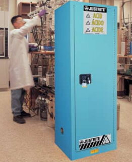 用于存放腐蝕品的Justrite 藍色鋼制安全柜所有型號均具有與Justrite 易燃液體安全柜相同的性能,包括雙壁結構、雙排氣口、地線接口、可調擱板、防漏底框、三點聯動式自鎖門和調平支腳。為具有耐強腐蝕性化學品的性能,酸類安全柜還在鍍鋅鋼擱板上安裝了聚乙烯底盤,并在底部盛漏槽中加設了獨立的聚乙烯襯套。襯套可拆除,便于清理滴落和泄漏的液體。廣受歡迎的114升雙開門安全柜還加設了一個聚乙烯柜頂工作盤,可固定于安全柜頂部,用作雜務臺面。內外壁全部采用環氧粉末烤漆涂層,具有更強耐化學腐蝕性。該涂料經過專門配制,能夠耐受實驗室常用的酸、堿和溶劑。通過FM認證。