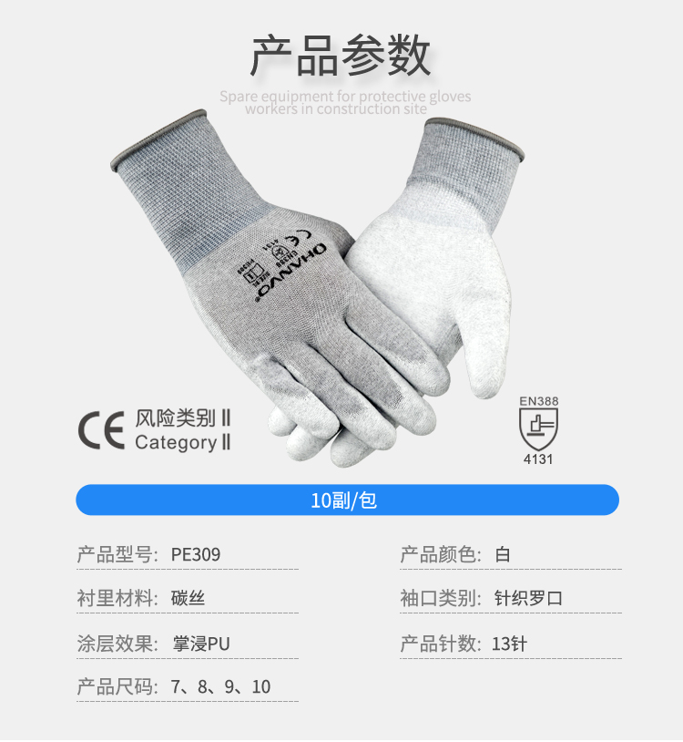 產(chǎn)品名稱:恒輝PM309防靜電手套PU手指浸膠涂層導(dǎo)電手套