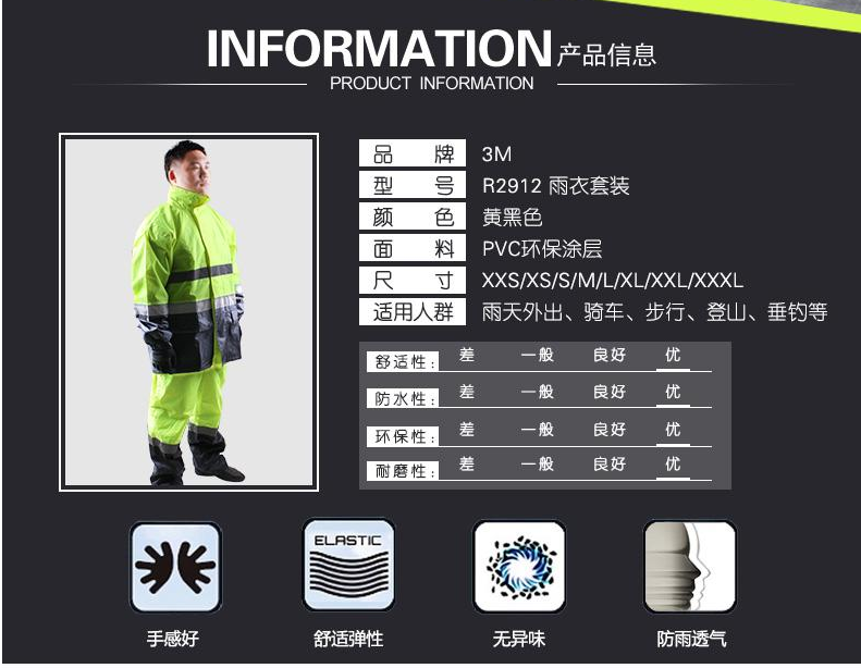 產品名稱:3M R2912 熒光黃拼色PVC防水安全警示服-XS