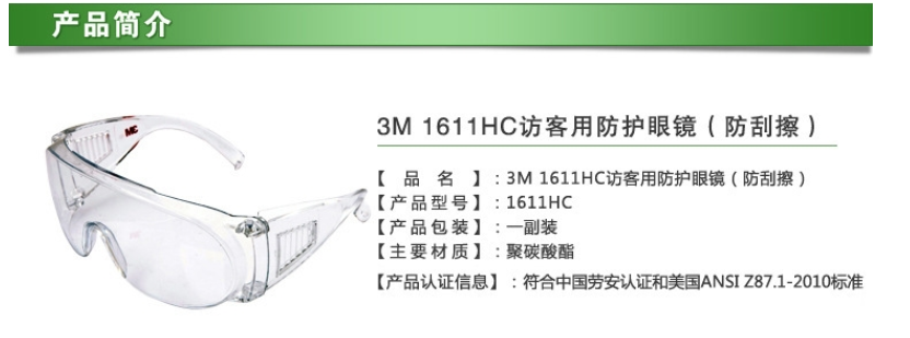 產(chǎn)品名稱:3M 1611HC 訪客用防護(hù)眼鏡(防刮擦涂層100副裝)